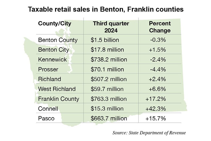 Taxable retail sales were up slightly across the state in the third quarter of 2024 but it was a tale of two counties in the Mid-Columbia, with Franklin County booming and Benton County seeing much less spending compared to the same period in 2023.