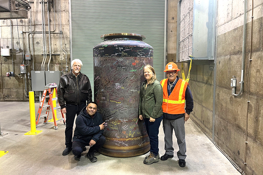 Ecology staff stand next to the first container of test glass at Hanford’s Waste Treatment and Immobilization Plant.