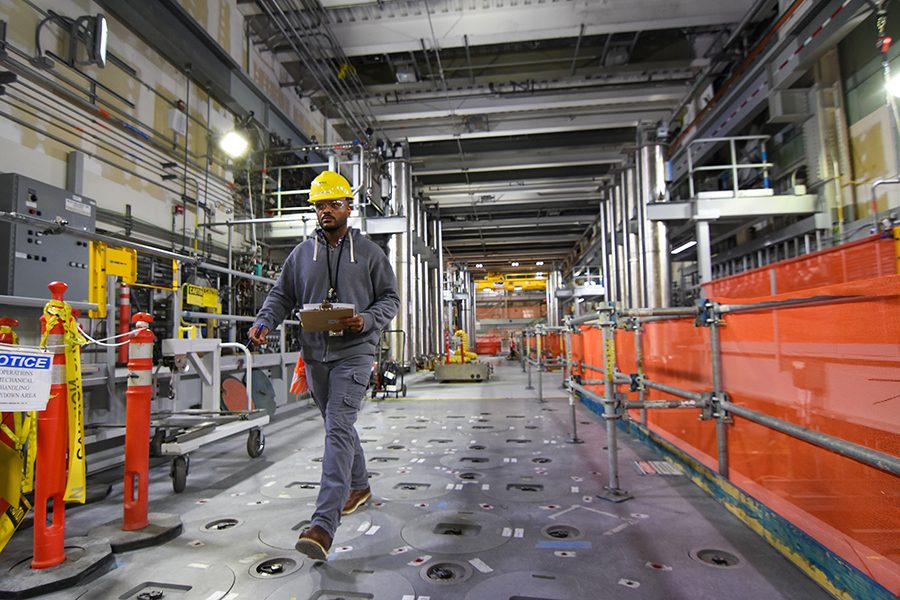 Worker walks through the Direct-Feed Low-Activity Waste (DFLAW) Facility with melter.