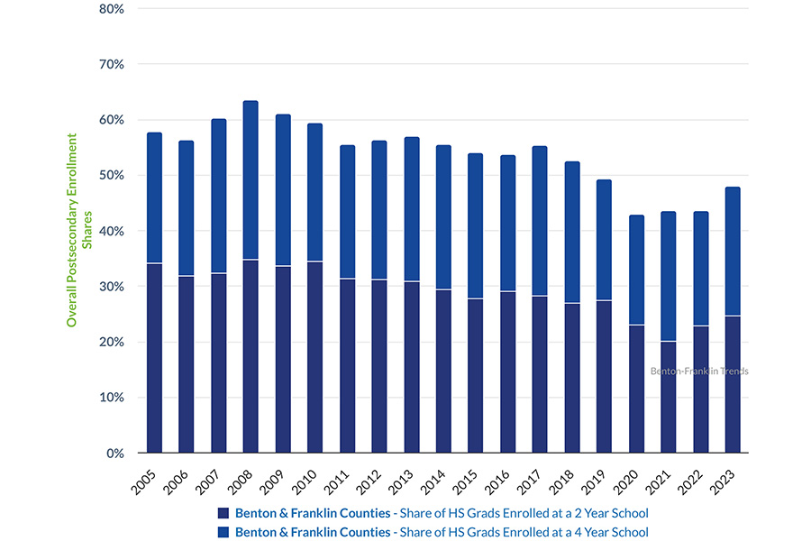 The accompanying graph from Benton-Franklin Trends depicts this decline. The lower part of each bar displays the share of public high school graduates who enrolled in a two-year institution within a year of graduation. The upper part of the bar shows the share of public high school seniors who enrolled in a four-year institution within 12 months of graduation. The scope of post-secondary schools is broad: any private (non-for-profit) or public, and located anywhere in the U.S.