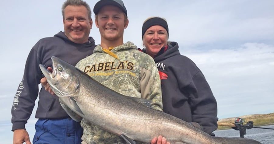 Mike Palmus and his wife, Rosemary, flank customer Kyle Whitby as they pose for a photo after a fishing excursion.
