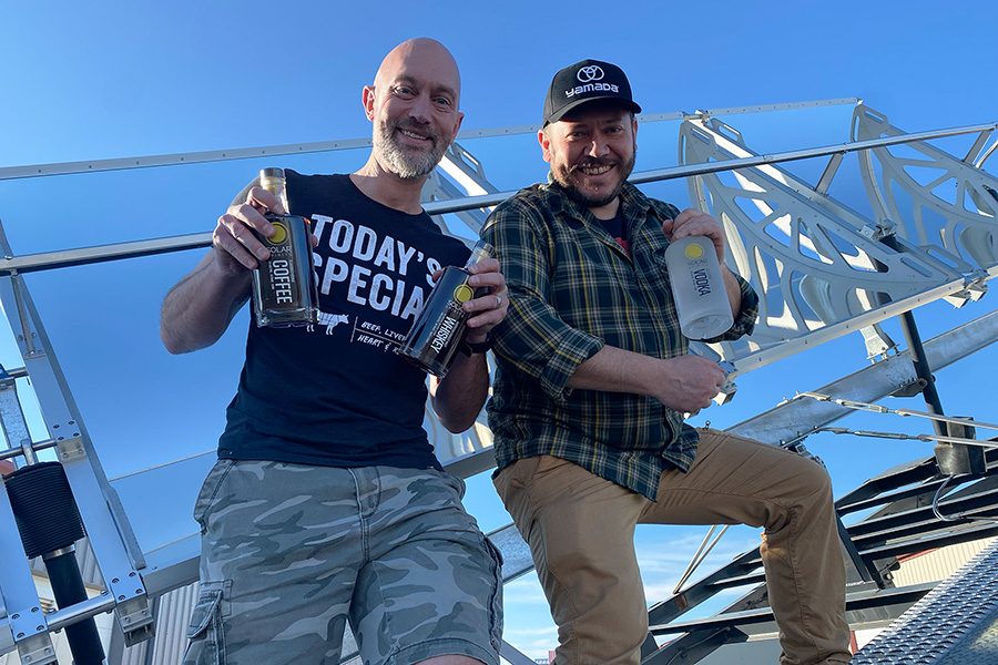 Daniel Watt, right, and Patrick McKennon display products while standing on a solar array behind the company’s production facility in Richland. The small distillery is expanding and opening a tasting room in The Parkway.