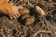 A hand picking up a potato from dirt.
