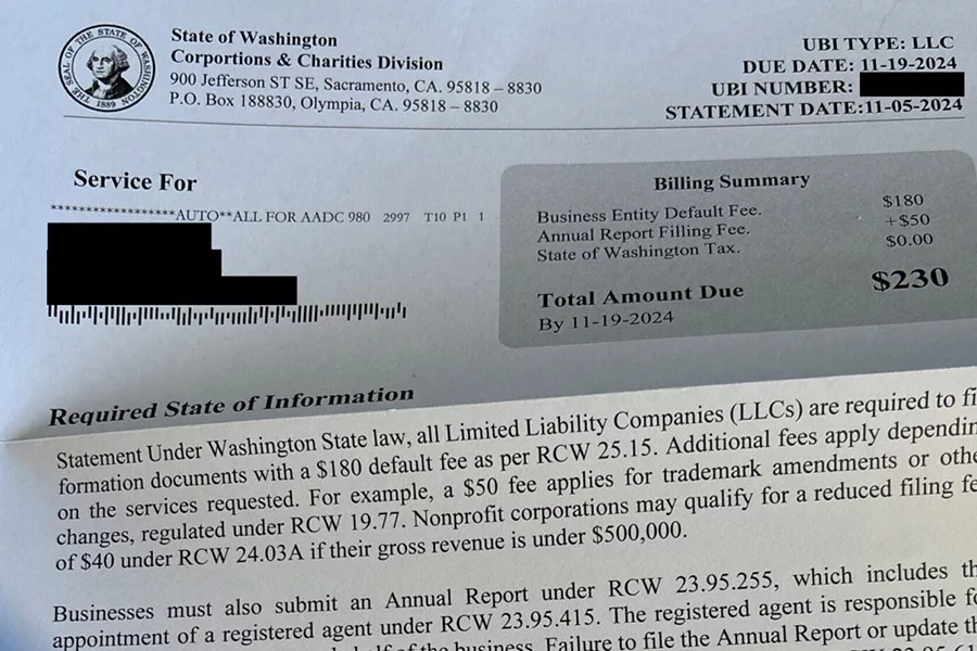 The secretary of state also lists tips on its website to help businesses identify fraudulent solicitations. The U.S. attorney’s office in Seattle suggests calling the agency that sent the communication using a phone number on its website to verify its legitimacy.