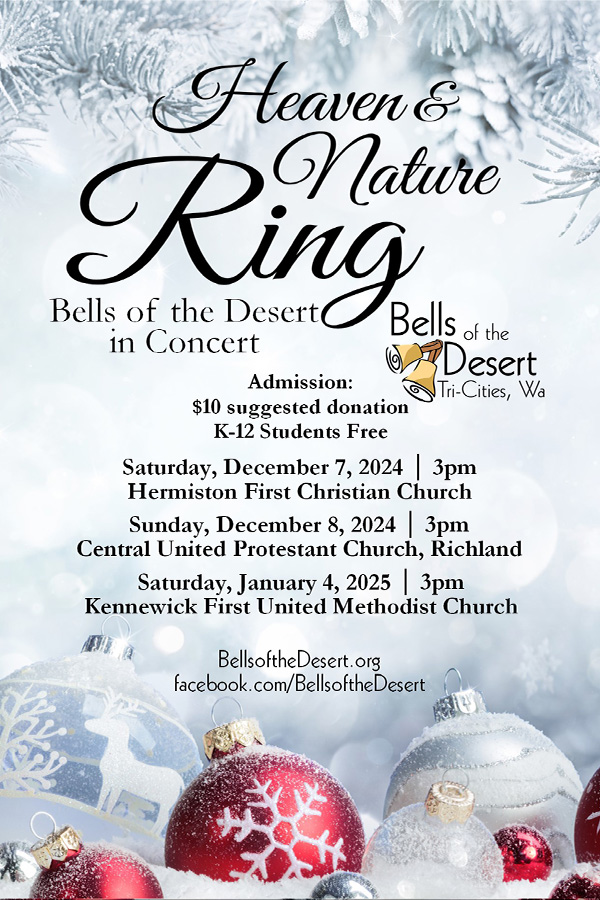 Bells of the Desert is proud to present their 2024 Christmas concert: Heaven & Nature Ring. Enjoy pieces including: "Joy to the World," "Christmas Angels," and "Let it Snow!" Please join us for this afternoon of music at 3pm on either December 7th at Hermiston First Christian Church, December 8th at Central Church in Richland, or January 4th at Kennewick First United Methodist Church.
