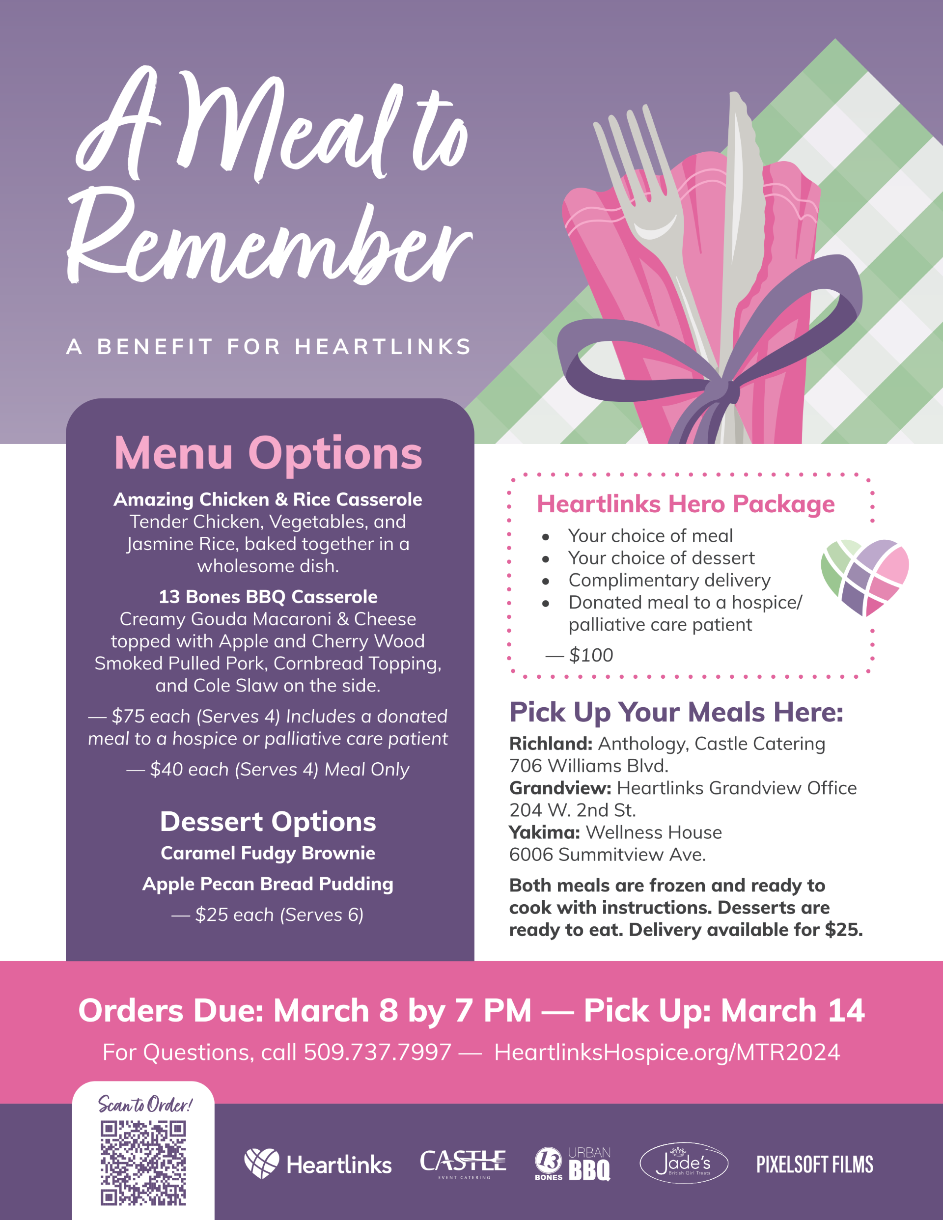 Every meal purchased benefits Heartlinks’ hospice and palliative care programs. Choose from two delicious meals and two scrumptious desserts with the option to give a meal to a hospice or palliative care patient.